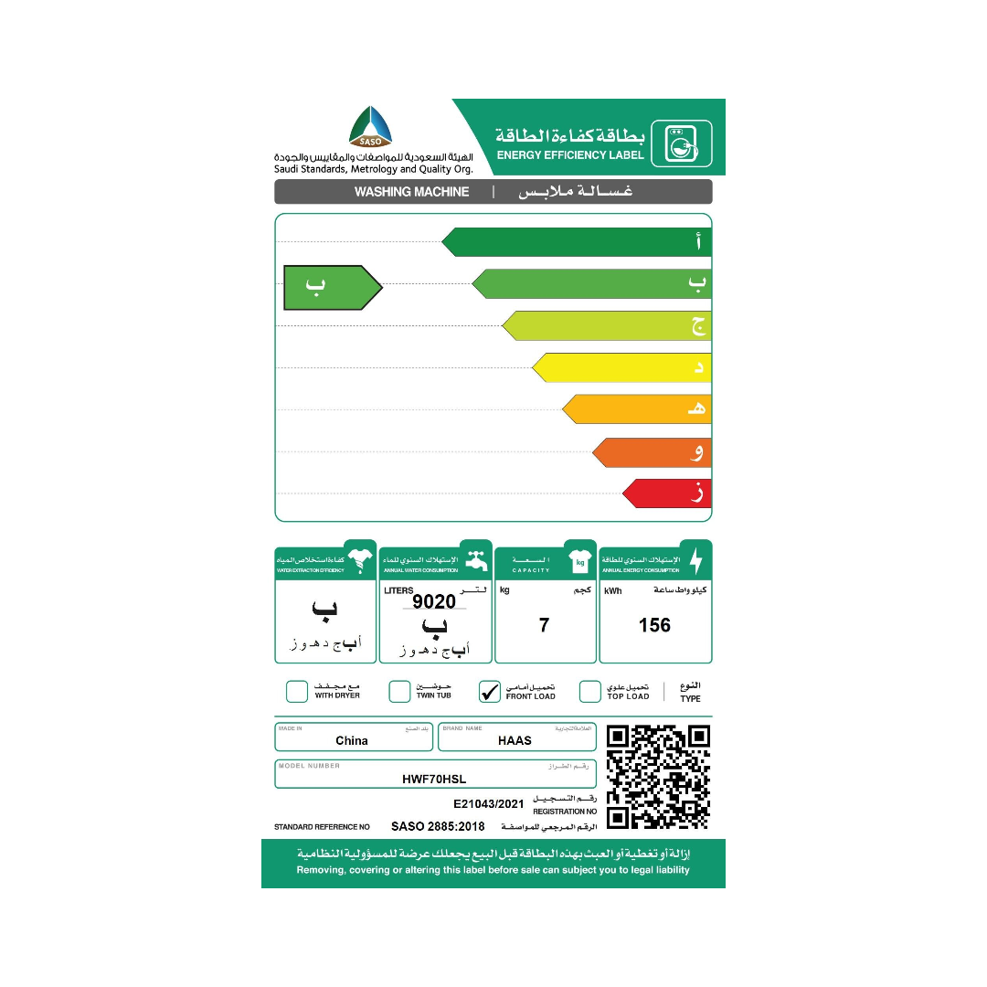 مواصفات غساله فتحة امامية هاس 7 كيلو 15 برنامج – سلفر :
