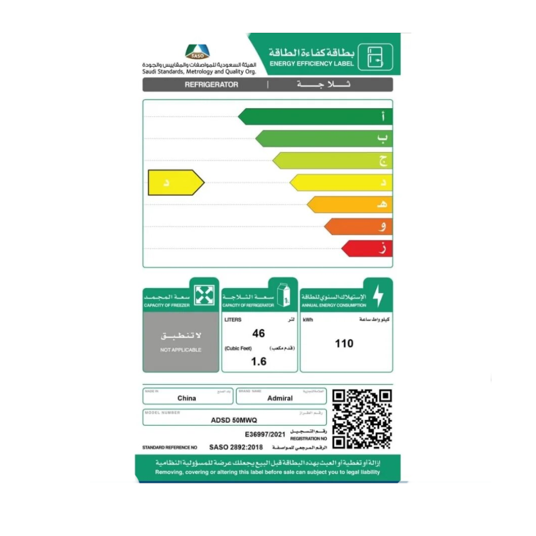 مواصفات ثلاجة عرض صغيرة باب واحد ادميرال 2 قدم – ابيض :