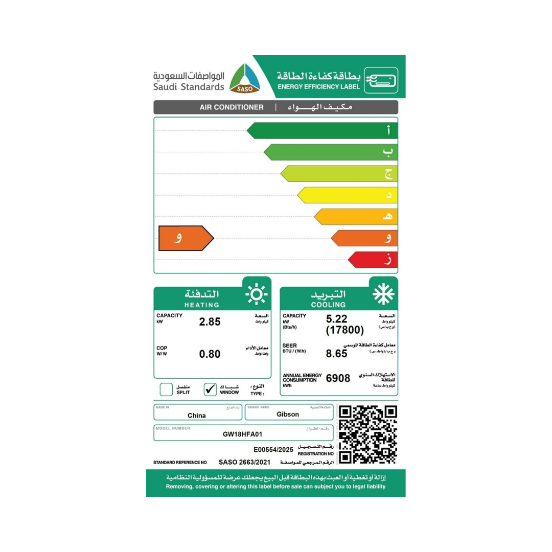 مواصفات مكيف شباك جيبسون 17800 وحدة حار – بارد :